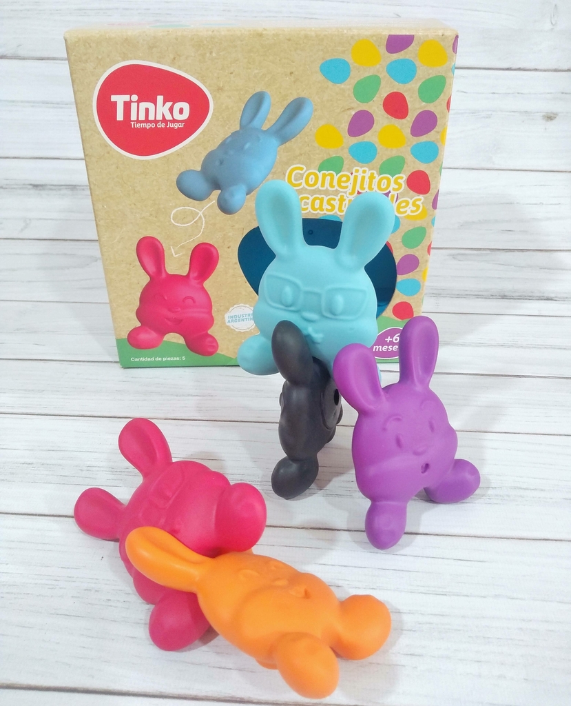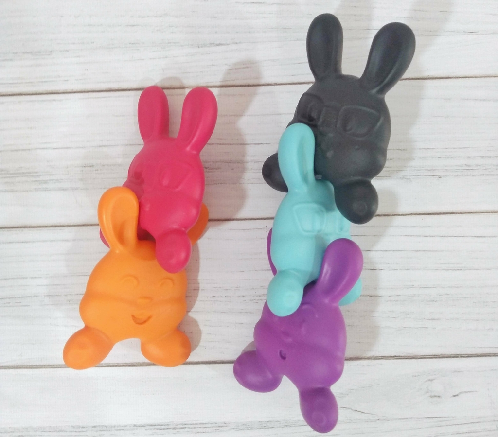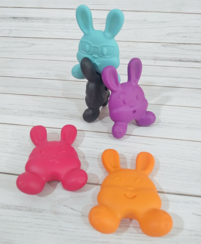 Conejitos de goma suave y blandita, son encastrables entre sí y pueden usarse como mordillo