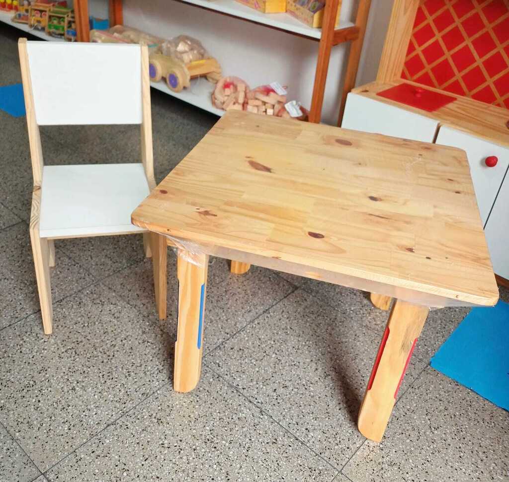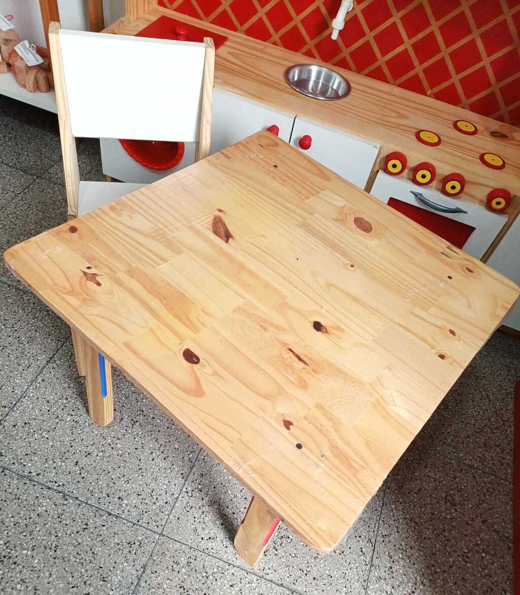Medidas: Mesa 60 cm x 60 cm x 47 cm de alto. Silla con un asiento de 30 cm x 30 cm x 30 cm hasta el asiento x 60 de alto total.