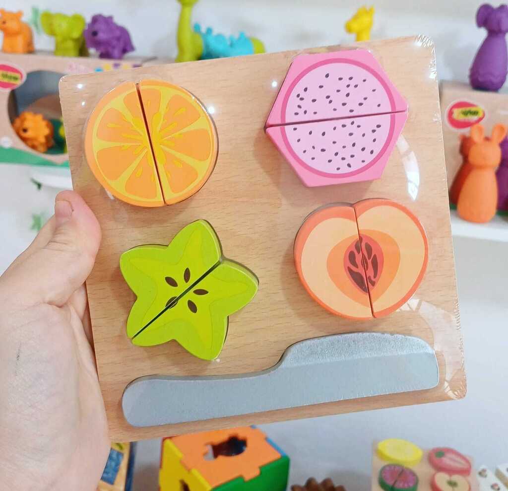 Son dos juegos en uno. Encastra las frutas en su base, asociando los colores y las formas