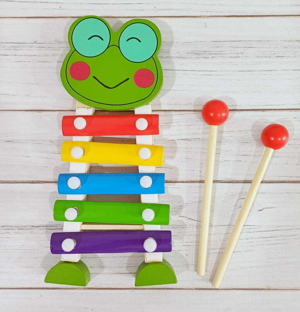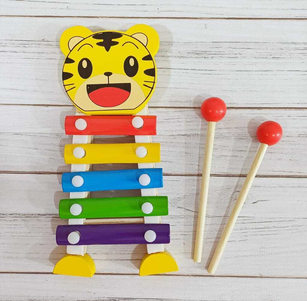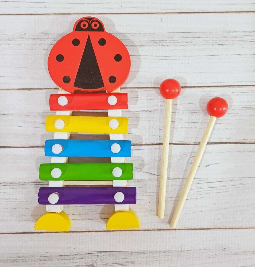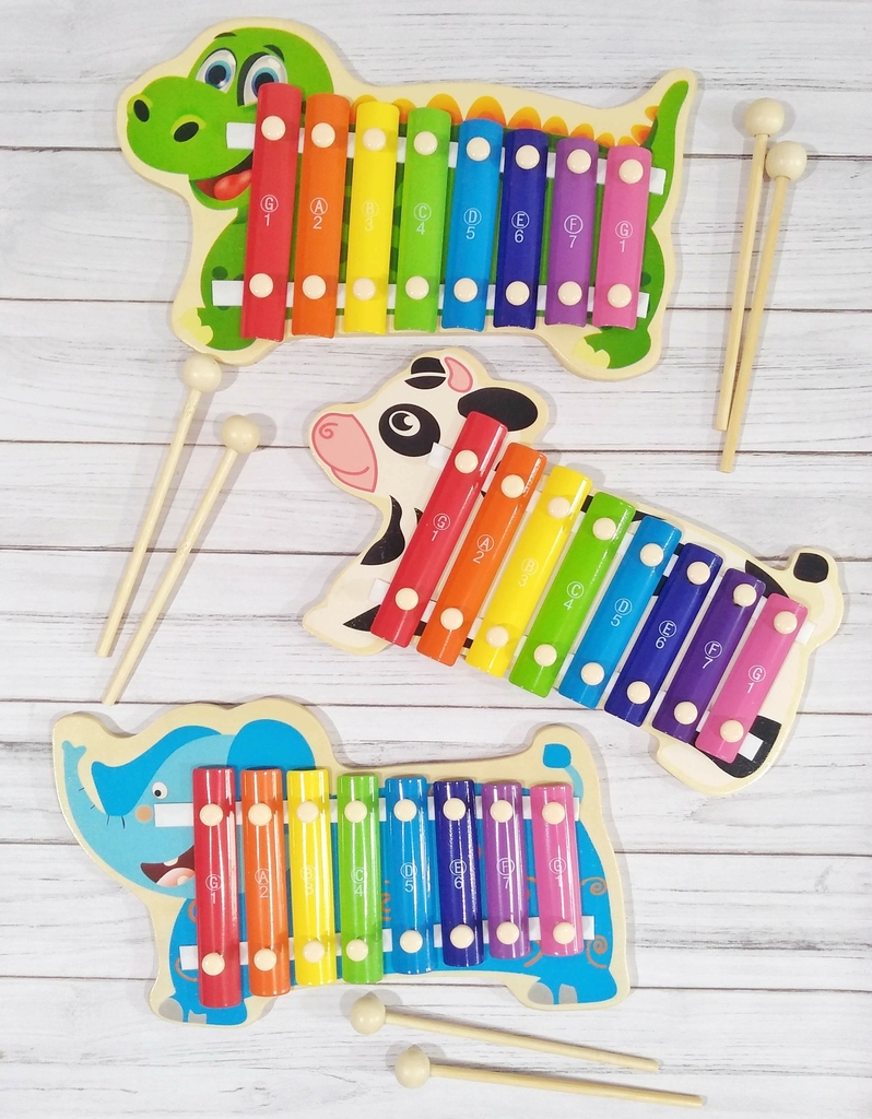 Base de madera. 5 y 8 Teclas metálicas de colores. Incluye 2 palillos de madera.